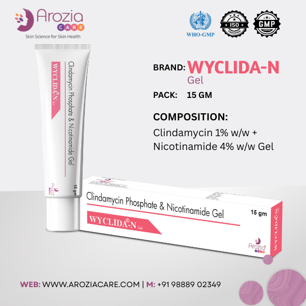 WYCLIDA-N Gel, manufactured under the Arozia Care brand, is a specialized dermatological formulation designed to combat acne and improve skin health. This 15g topical treatment combines two powerful active ingredients: Clindamycin Phosphate (1% w/w) and Nicotinamide (4% w/w). This synergistic combination addresses the multi-factorial nature of acne, targeting bacterial growth, inflammation, and skin barrier integrity.